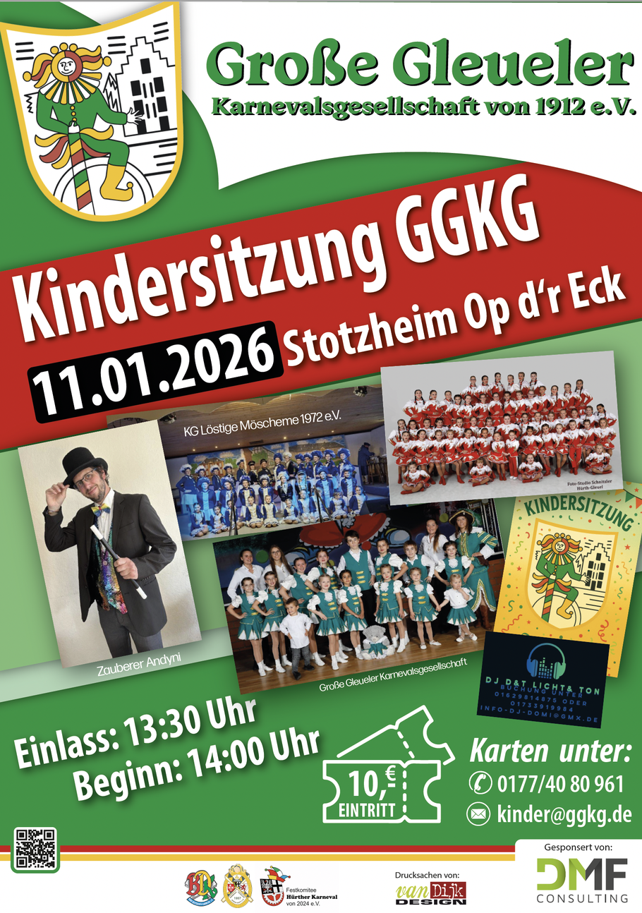 In Stotzheim im Saal im Kulturhaus "Op d´r Eck" verzücken Euch die Kinder und Jugend der KG Löstige Möscheme, der Funken Rot-Weiß Hürth-Gleuel und natürlich das Kinder- und Jugendtanzcorps der Großen Gleueler Karnevalsgesellschaft.